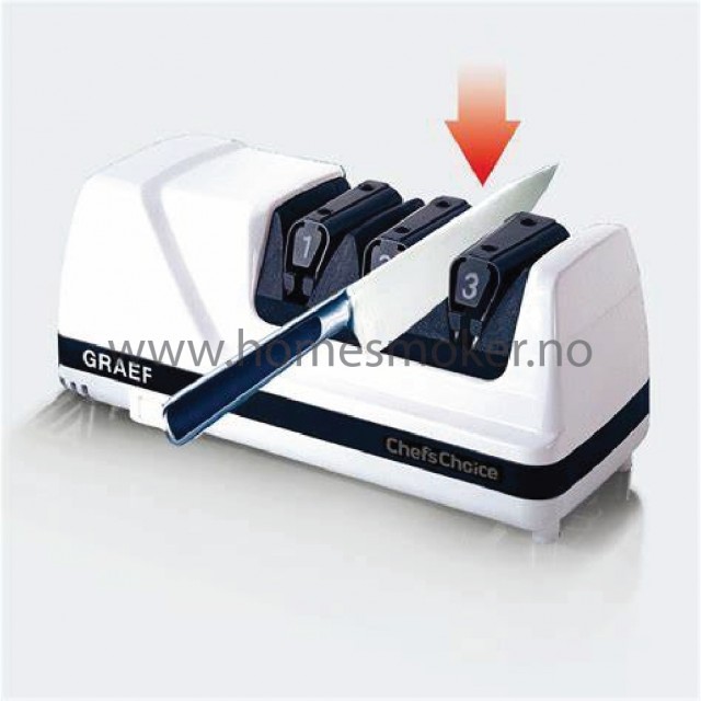Graef Knivsliper - CC120 Artikkelnr.: 2300 Enkel betjening og skarpe kniver med jevn egg NOK2 495,00 inkl. mva. Kjøp Del dette Produktinfo Produktanmeldelser (0) Graef/Chefs Choice profesjonell elektrisk knivsliper. Med tre stasjoner.To stasjoner med koniske 100% diamant belagte disker, og på Stasjon 3 sitter det en polerings disk for og ta den siste finishen på kniven. Sliperen tar alle slags kniver, fra brødkniven til filet kniven.På bare sekunder, er en kantete og sløv kniv blitt til en holdbart skarp kniv, feilfri og blankpolert. Tre års garanti. Laga og sammensatt i USA. Eit must i hjemmet. Bruk: Første gangen man setter opp en kniv med Graef CC120 kan man begynne med Stasjon 1. Sjekk eggen etter like mange "drag" på hver side på stasjonen. Når man har en jevn egg går man videre til Stasjon 2. Når man har jevn egg på Stasjon 2 går man videre til Stasjon 3. Har man tidligere satt opp kniven med Graef CC120 eller har egg på rundt 20 grader, kan man begynne rett på Stasjon 2 før man avslutter med Stasjon 1. Kan være fordel å dra kniven over poleringsstål til slutt for å fjerne siste rest av egg. Se link for demonstrasjon av produktet: YouTube Skriv en produktanmeldelse og del dine erfaringer med dette produktet med andre kunder. Email Navn Din vurdering? 1 star 2 star 3 star 4 star 5 star 6 star Oppgi en tittel for anmeldelsen din Skriv inn produktanmeldelsen i feltet under