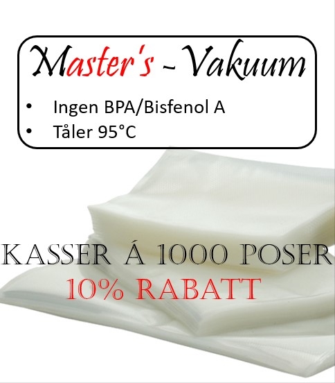 Vakuum-poser, 30x50cm - 1000 poser, 20% rabatt Artikkelnr.: 6205-1000 Master´s Vakuumposer - finperforerte kvalitets poser. 20 pakker á 50 poser gir 10% rabatt - for deg som pakker mye NOK7 184,00 Førpris:NOK8 980,00 Rabatt -20% inkl. mva. Kjøp Del dette Produktinfo Produktanmeldelser (0) Ferdigkuttede poser er faktisk både billigere og arbeidsbesparende i forhold til poser på rull. Obs: Før bestilling, vær obs på hvor bred sveiselist maskinen din har - denn posen krever 30 cm breide Posene er selvfølgelig 100 % lufttette. Øker holdbarheten med 5-10 ganger, se holdbarhetstabell. Egnet for lagring i kjøl og frysing i flere år. 100 % uten mykningsmidler (for eksempelvis bisfenol A), mange billig produkter som bruker mykningsmidler. Kan brukes i mikrobølgeovn, og egner seg til SousVide opp til 95 °C. Kan puttes i oppvaskmaskinen og kan dermed brukes flere ganger. Skriv en produktanmeldelse og del dine erfaringer med dette produktet med andre kunder. Email Navn Din vurdering? 1 star 2 star 3 star 4 star 5 star 6 star Oppgi en tittel for anmeldelsen din Skriv inn produktanmeldelsen i feltet under